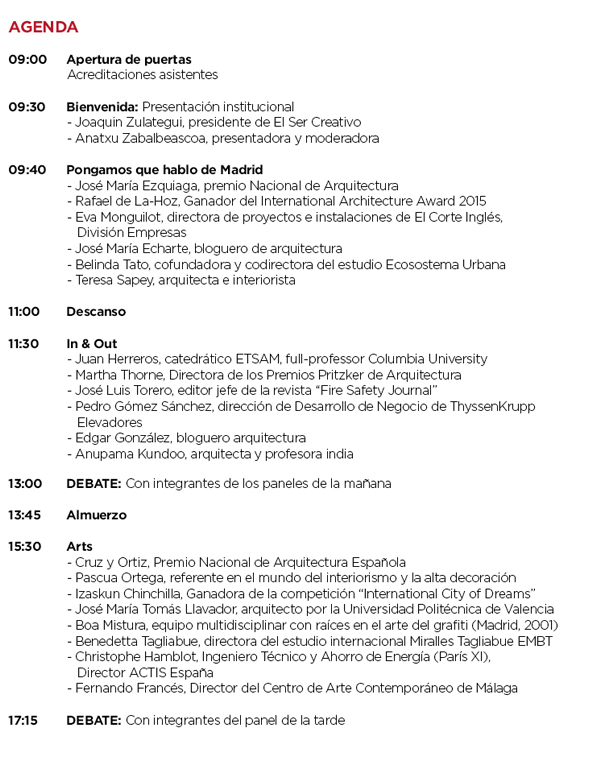 Open House Madrid y El Ser Creativo presentan la primera edición de "El futuro de las ciudades", un encuentro que contará con la presencia de los mejores expertos del mundo en arte y arquitectura y que celebrará su primera edición en Madrid el próximo 23 de septiembre. El encuentro se celebrará en el salón de actos de Conde Duque (C/Conde Duque, 11) desde las 09:30h hasta las 18:00 (apertura de puertas a las 09:00h)
